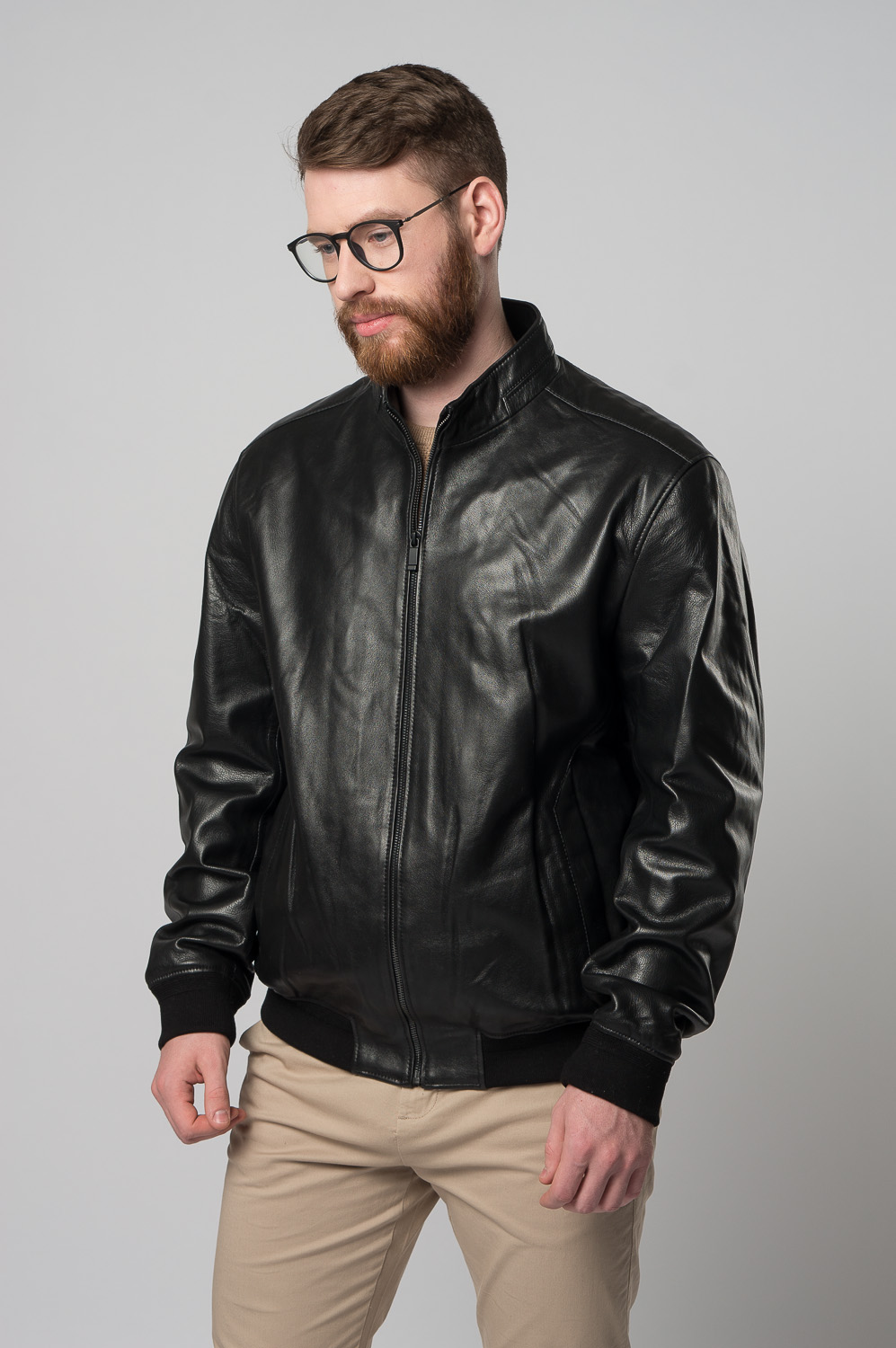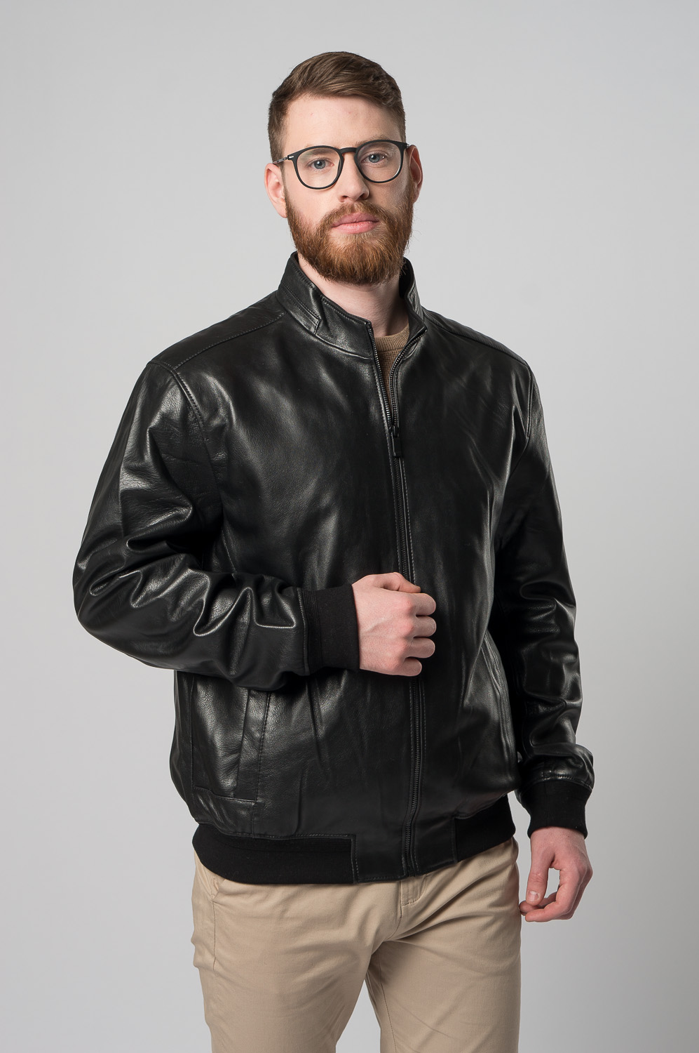 Классическая мужская куртка-бомбер на молнии в черном цвете. Это изделие выполнено из приятной на ощупь, прочной и износостойкой натуральной кожи. Фасон бомбер позволяет куртке надежно фиксироваться на теле за счет резинок по низу изделия и на рукавах. Модель дополнена невысоким воротником-стойкой и кнопками. Отлично сочетается с брюками, джинсами, ботинками и кроссовками. Подходит для городской жизни.