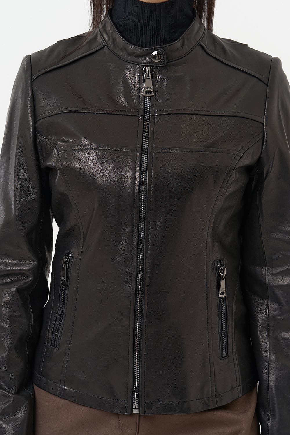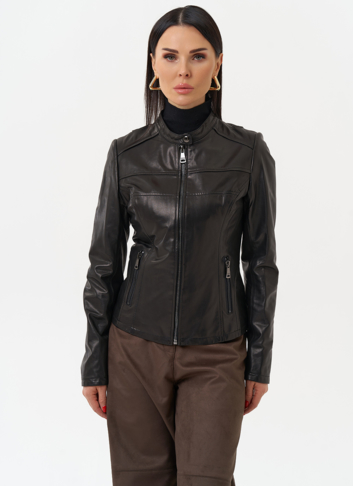 Элегантная женская куртка из натуральной кожи в черном цвете с бронзовым блеском. Классический полуприлегающий фасон подойдет для сдержанных и элегантных образов. Данный оттенок сочетается со всеми цветами, что делает данную куртку базовой в вашем гардеробе. Фигурные вытачки данной модели визуально стройнят. Изделие дополнено аккуратным воротом-стойкой и молнией. Представлен большой размерный ряд от 42 до 52 размера.