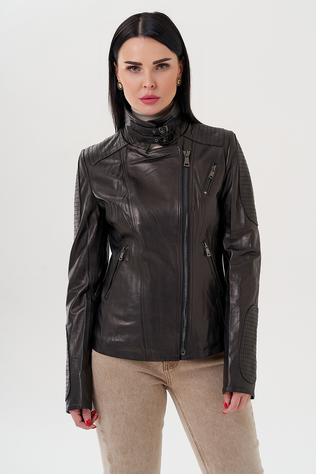Куртка из натуральной кожи - изящная и универсальная вещь в гардеробе. Выполнена в черном цвете, что делает ее практичной. Модель приталенная, что делает ее более женственной. Застегивается на молнию. Воротник можно поднять и закрепить на ремешки. По бокам есть карманы на молнии. Куртка стилизована накладными вставкамина рукавах и плечах.